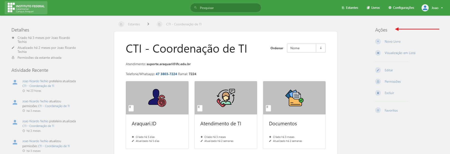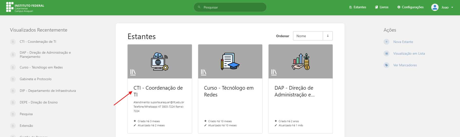 Neste tutorial, iremos simular o usuário "joao.techio"teste.teste" que faz parte do grupo CTI, e que tem autorização para criar, editar e excluir conteúdos dentro da estante CTI - Coordenação de TI, clique na estante para acessá-la: