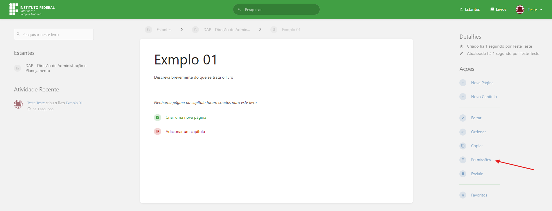 Seguindo, ao salvarmos as permissões, e etendermos que o livro tem perfil público, iremos criar nosso primeiro caítulos e nossas primeiras página
