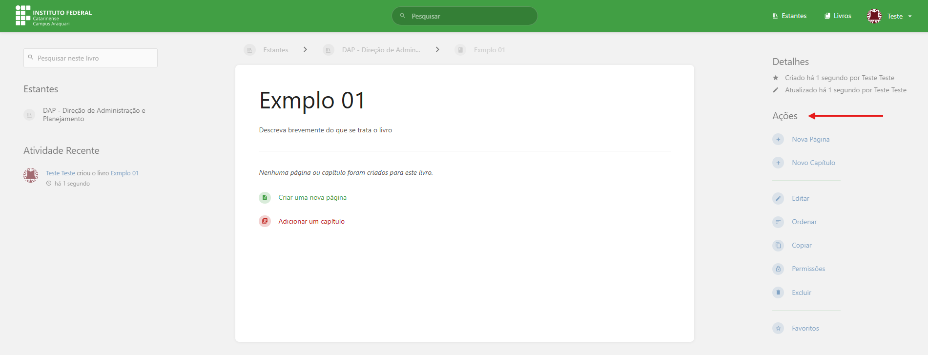 Ao clicarmos em salvar livro, você será direcionado automaticamente para criação de página e capítulos, conforme mostra a imagem abaixo; perceba que a opção lateral de Ações também ficou disponível e é nela onde faremos a maior parte das configurações: