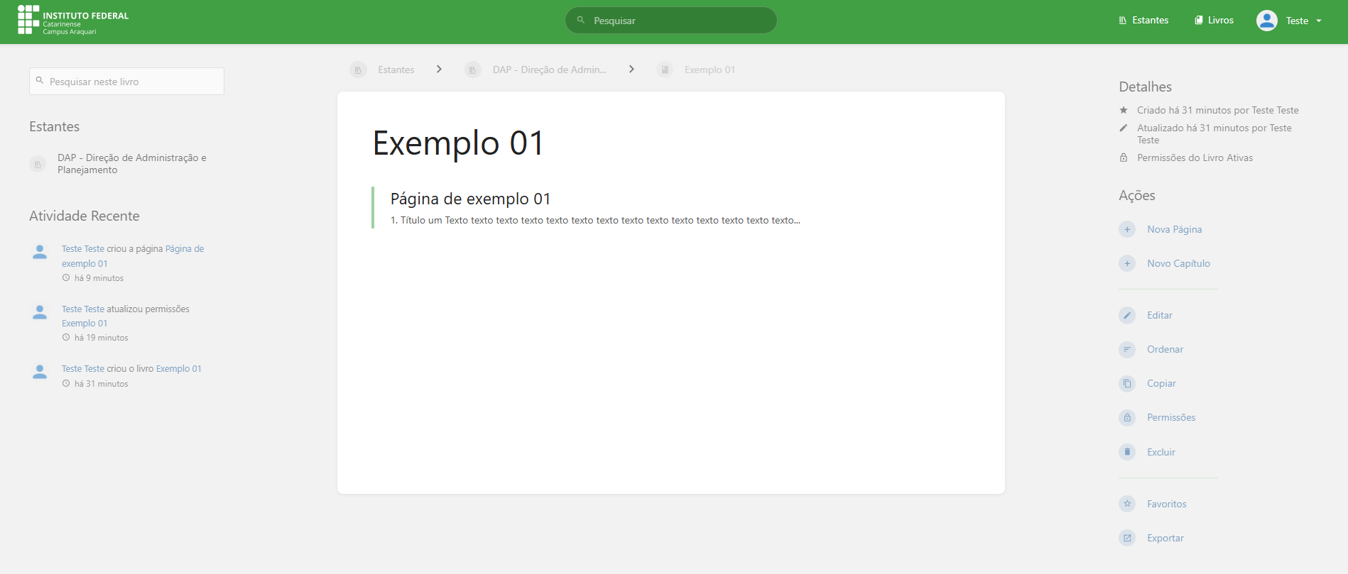 Ao clicarmos em salvar livro, você será direcionado automaticamente para criação de página e capítulos, conforme mostra a imagem abaixo; perceba que a opção lateral de Ações também ficou disponível e é nela onde faremos a maior parte das configurações: